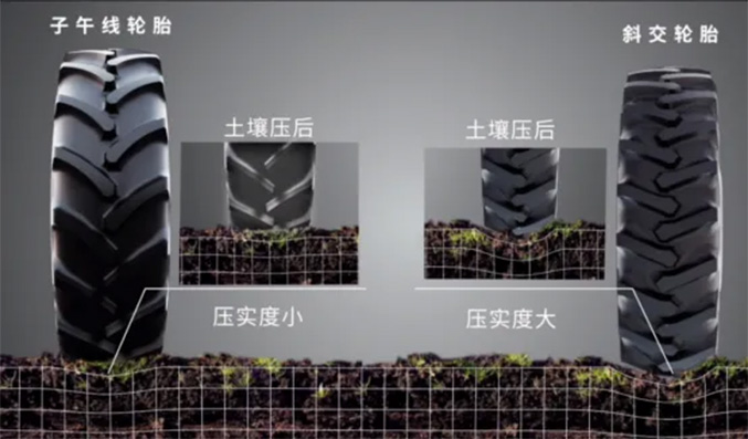 試驗數據顯示,子午線(xiàn)輪胎接地麵積(jī)優勢顯(xiǎn)著。在相同的胎壓(yā)下(xià),前進子午線胎(tāi)平均接地麵積比其他競品和斜交輪胎的更寬,子午線輪胎的(de)對土壤壓實度更小,進而提升聯合收割機的動力性能。值得注意的是,子午線輪胎僅產生周向形變,徑向保(bǎo)持穩定,而斜交胎則徑向周向均發生形變,這為其性能突破奠定了結構基礎。