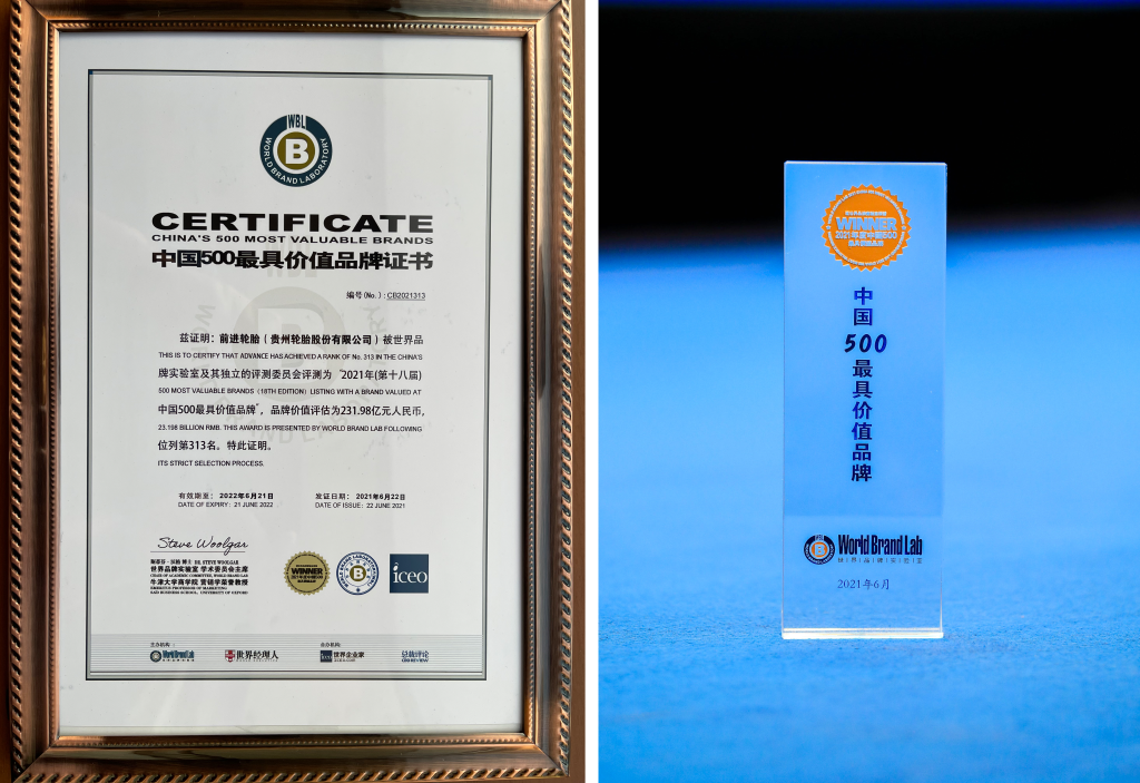 6月22日下午(wǔ),由世界品牌實驗室(World Brand Lab)主辦的(de)(第十(shí)八屆)“世(shì)界品牌大會”在北京舉行,會上發布了2021年《中國500最具價值品牌》分析報告,在(zài)這份基於財務數據、品牌強度和消費者行為分析的年度報告中,貴州(zhōu)輪胎前進品牌以價值(zhí)231.98億元人民幣位列2021年中國(guó)500最具價值品牌313位,比2020年上升49位,品牌價(jià)值增加71.67億元人民幣,實現了品牌價值的持續提升。