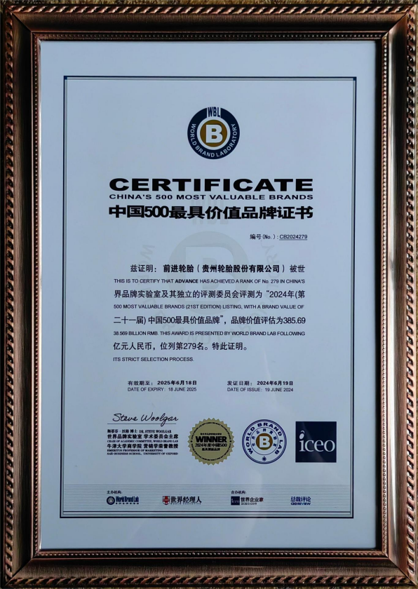 世界品牌實驗室(World Brand Lab)是一家國際化的品牌價(jià)值研究機構,全資附屬於世界領先(xiān)的數字技術和戰略谘詢公司,其研究成果已(yǐ)經成(chéng)為許多企業並購過程中無形資(zī)產評估的重要依據。已(yǐ)連(lián)續二十一年(nián)發布的《中國500最具價(jià)值品(pǐn)牌》,采用“收益現值(zhí)法”對品牌價值進行測評。在這份基於財務數據(jù)、品牌強度和消費者行為(wéi)分析(xī)的年度報告中,貴州輪(lún)胎前進品牌憑借(jiè)核心科技產(chǎn)品增強市場營銷(xiāo)影(yǐng)響力、數字渠道建設(shè)、增強新(xīn)媒體數字(zì)營銷宣傳、數字化品牌建設,在2024年中國500最具價值品牌發布會中,貴已價值385.69億元人(rén)民幣,位列2024年中國500最具價值品牌279名,比2023年增加72.74億元,上升(shēng)18名。