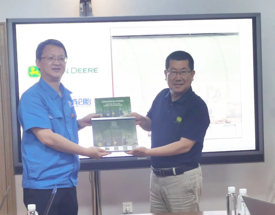 約翰迪爾中國區總(zǒng)裁(cái)孫寶林先生(shēng)到貴州輪(lún)胎實地考察,並為(wéi)貴州輪胎頒發2023年“夥伴級供(gòng)應商獎牌”。貴州輪胎黨委書、董事長黃舸舸(gě)先生表示,感謝約翰迪(dí)爾的高(gāo)度認可和信賴,貴州輪胎將堅持“國際化、綠色化、智能化、高端化”發展道路,為全球(qiú)客戶帶來更多特殊(shū)場景(jǐng)需求的產品和更優質快捷的服務。未來,雙方將繼續擴大合作麵,共(gòng)同努力向全球市場和終端延伸,重視局域市場的特殊需(xū)求,致力於(yú)向全(quán)球農機用戶提供更高效的作業(yè)平台。